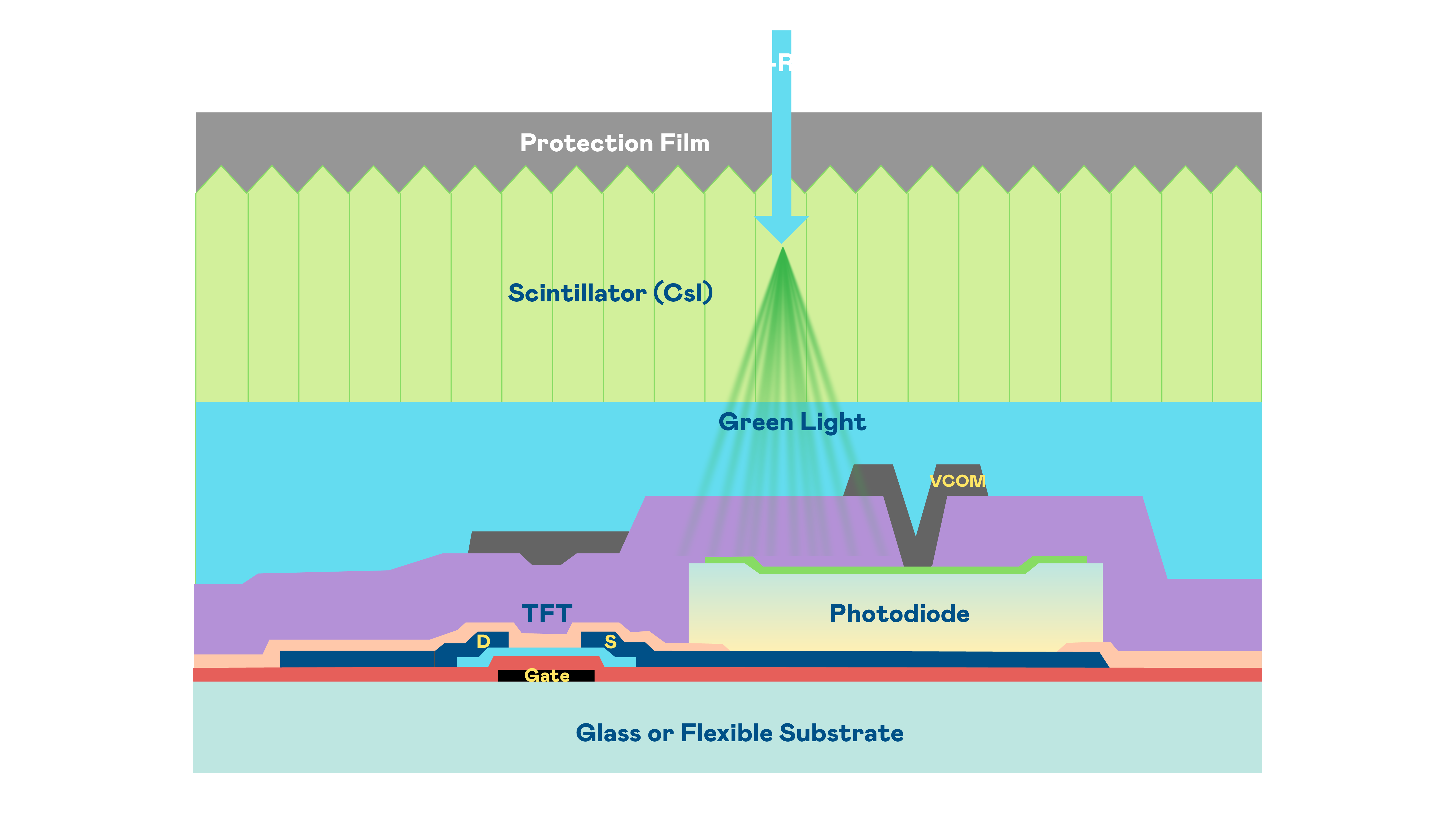 尊龙凯龙时官网的X光影像感測陣列使用薄膜電晶體 (TFT) 作為每個像素的讀取開關,搭配光電二極體(Photodiode)的光電轉換元件,用以感測X光影像訊號。